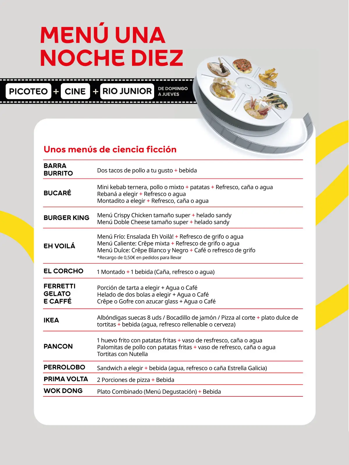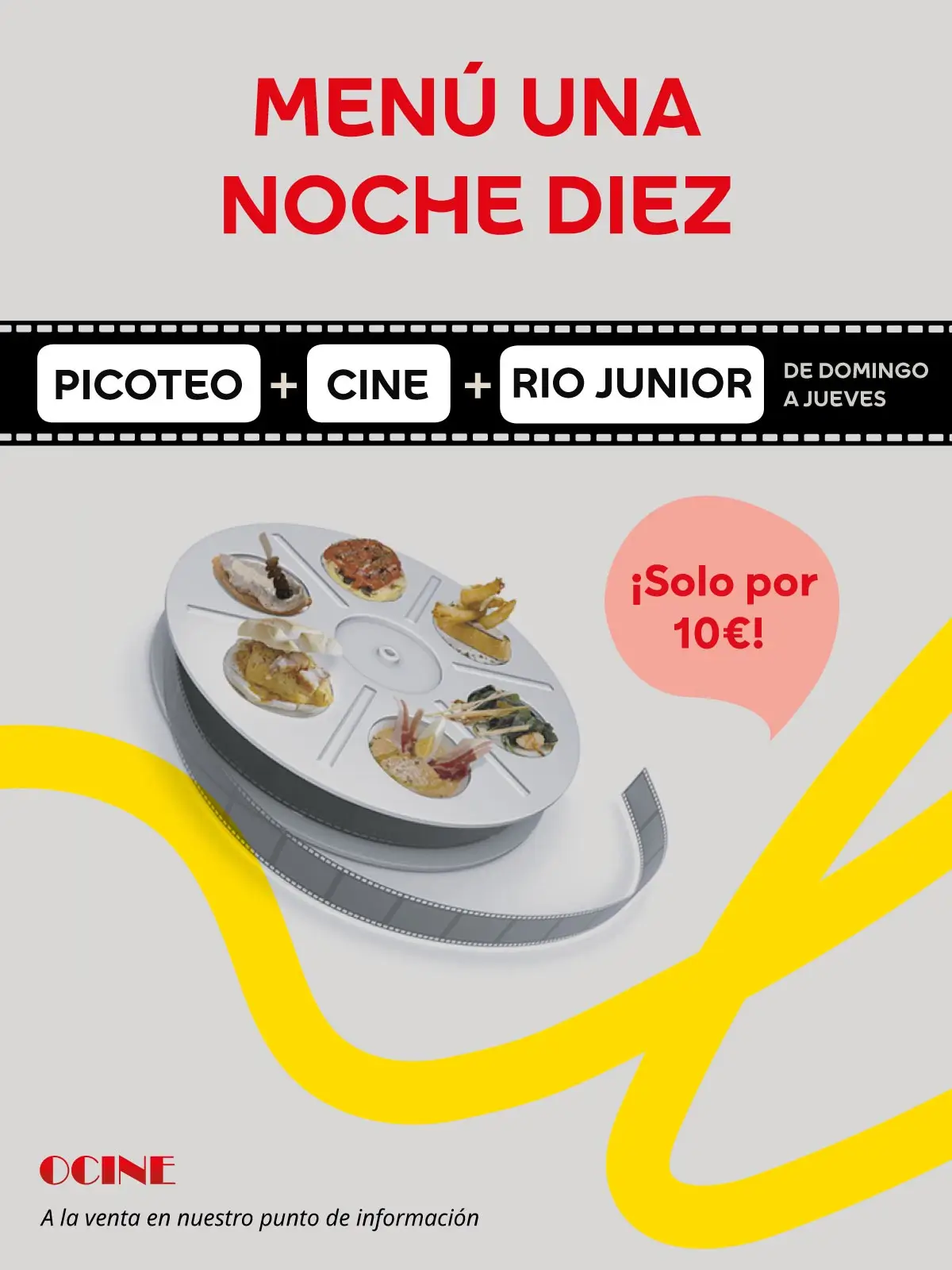 Por solo 10€, disfruta cuando quieras de un picoteo en tu restaurante preferido y elige peli entre nuestros estrenos en las mejores salas de cine de la ciudad, OCINE y de RÍO Junior!