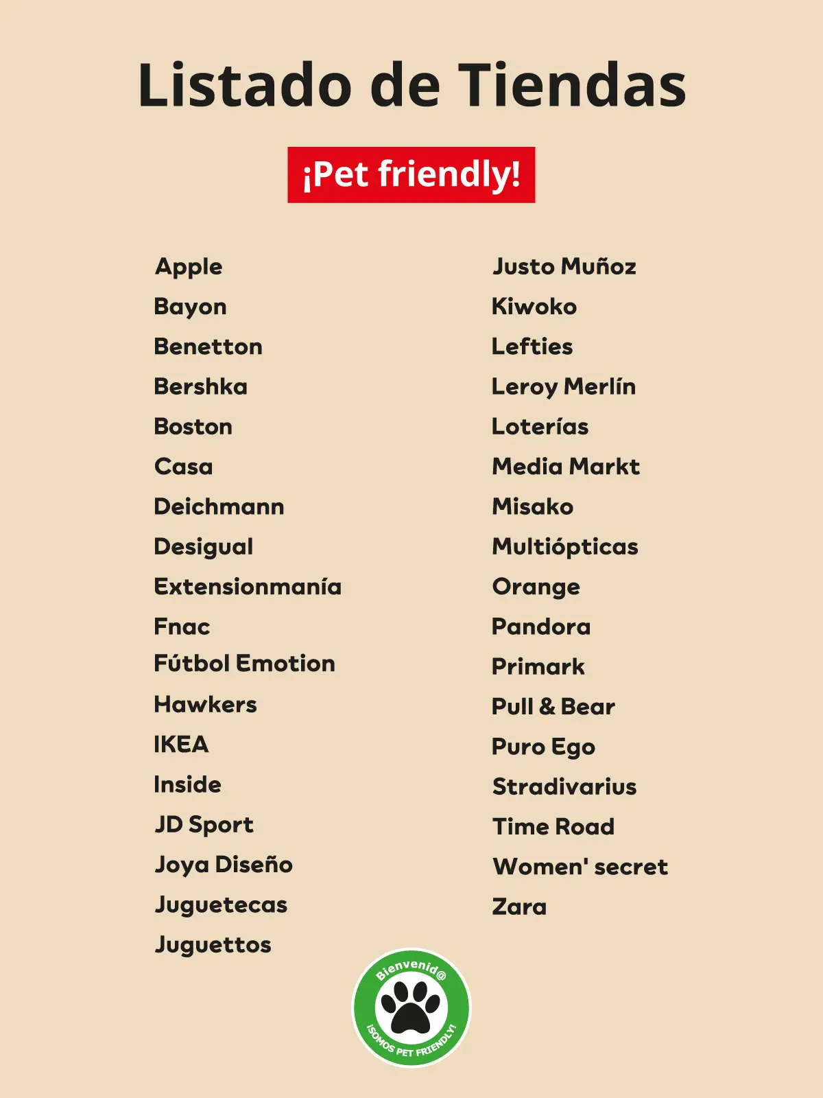 Nuestros visitantes ya pueden transitar con sus mejores amigos por nuestras zonas comunes, así como entrar en los establecimientos identificados con un adhesivo verde en el que se puede leer “BIENVENIDO/A ¡SOMOS PET FRIENDLY!”.